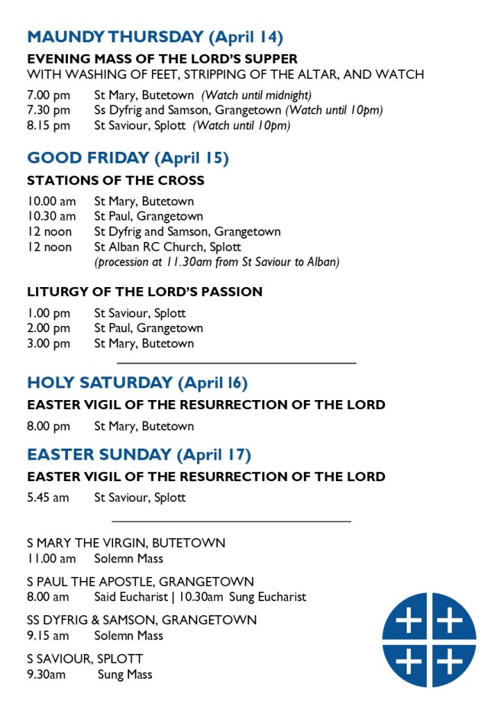STATIONS OF THE CROSS: In addition to the Liturgy of the Lord’s Passion, there will be the opportunity to walk the Stations of the Cross on Good Friday in the churches of the Ministry Area, including a joint Stations with St Alban’s RC Church in Splott (at 12 noon) which begins with a procession from St Saviour’s to St Alban’s beginning at 11.30am.