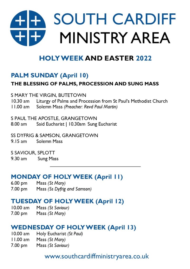 BUTETOWN: S MARY THE VIRGIN The Blessing of Palms and Procession begins at St Paul's Methodist Church, Loudoun Square at 10.30am. 1100hrs Solemn Mass (Preacher: Revd Paul Martin) GRANGETOWN: S PAUL THE APOSTLE 0800hrs Said Eucharist 1030hrs Sung Eucharist SS DYFRIG & SAMSON 0915hrs Solemn Mass SPLOTT: S SAVIOUR 0930hrs Sung Mass