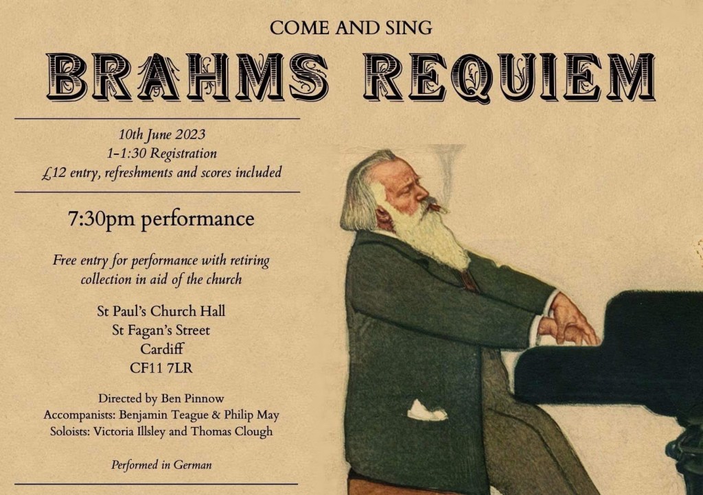 Come and sing Brahms Requiem at St Paul’s Church, Grangetown on 10 June 2023. Registration takes place between 1 and 1.30pm with a £12 entry – refreshments provided.
