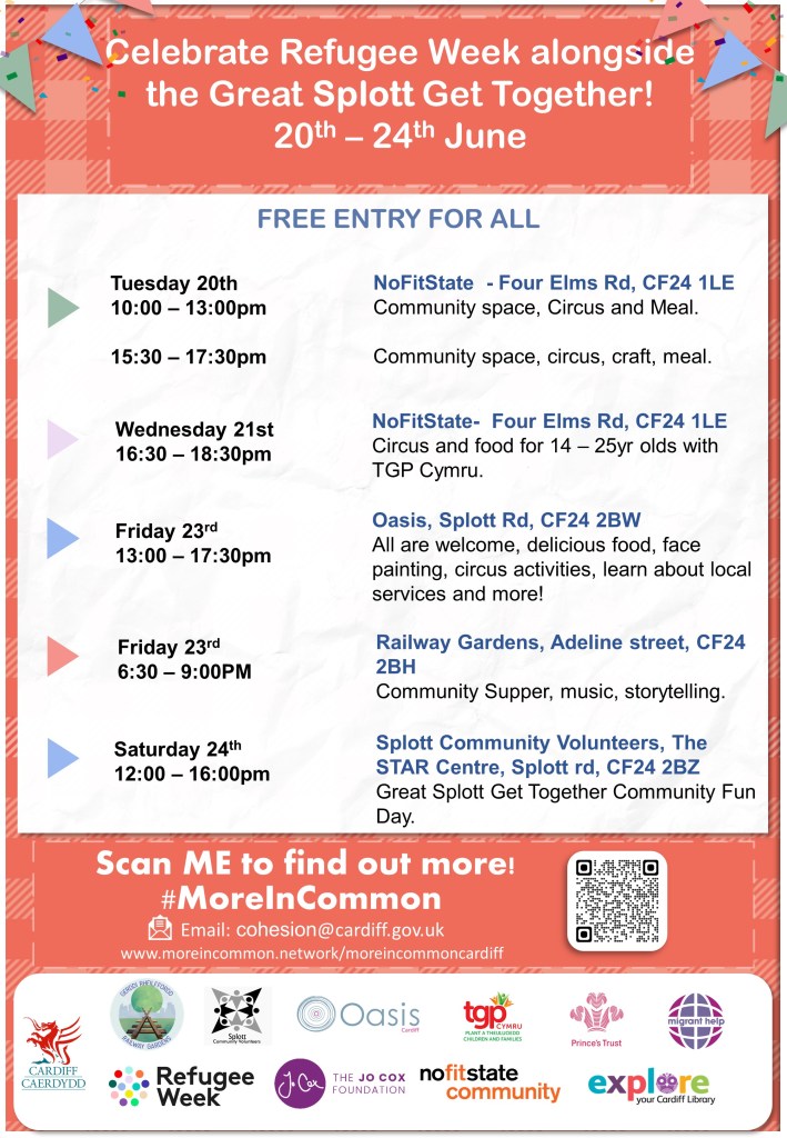 As well as the events across Butetown, there are some amazing activites across Splott from Storytelling and Community Suppers, from Circus events to food and fun at the Oasis Centre on Splott Road!