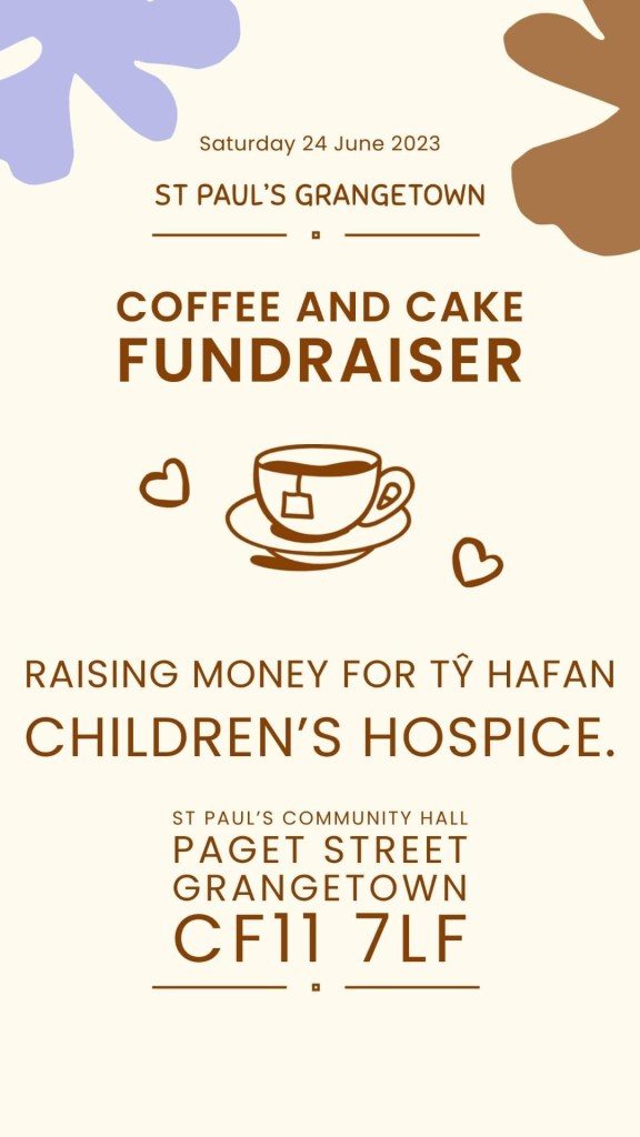 The next coffee morning is on Saturday 24 June at 10.30am and it’s all in aid of Ty Hafan Children’s Hospice. Please come along!