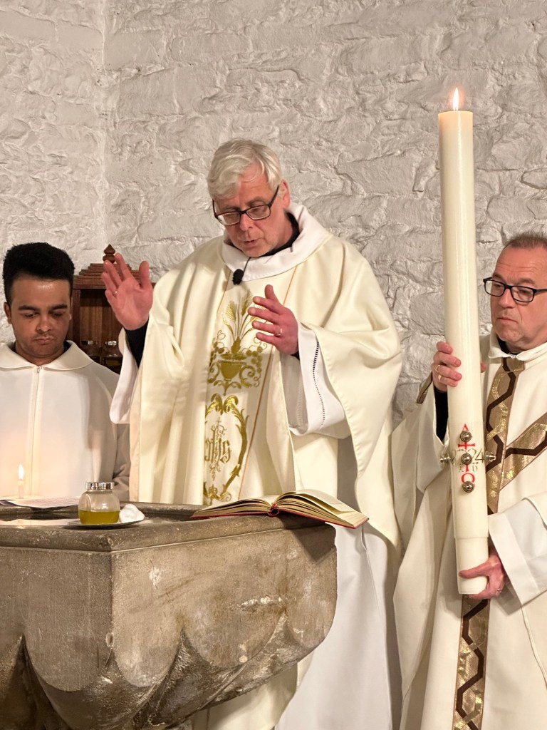 The Paschal Candle was blessed and lit as we gathered in darkness for the Easter Vigil. “Let it mingle with the lights of heaven” go the words of the Easter Proclamation sung by the deacon or priest.