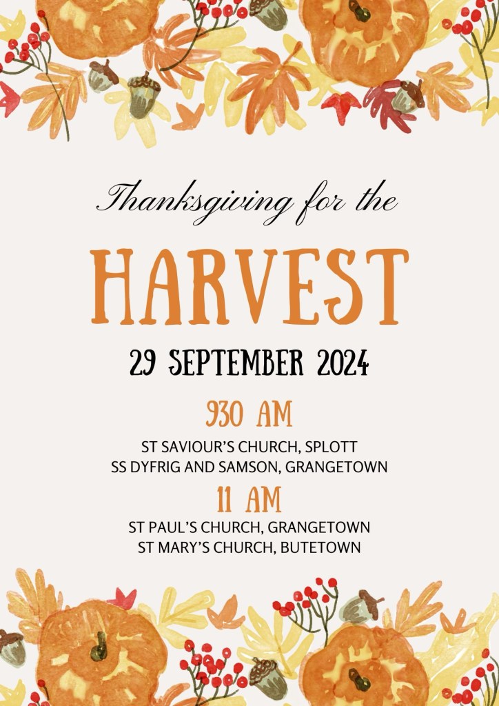 On Sunday we celebrate thanksgiving for the Harvest at all the churches across the Ministry Area. Offerings of food for Cardiff Foodbank are welcome .