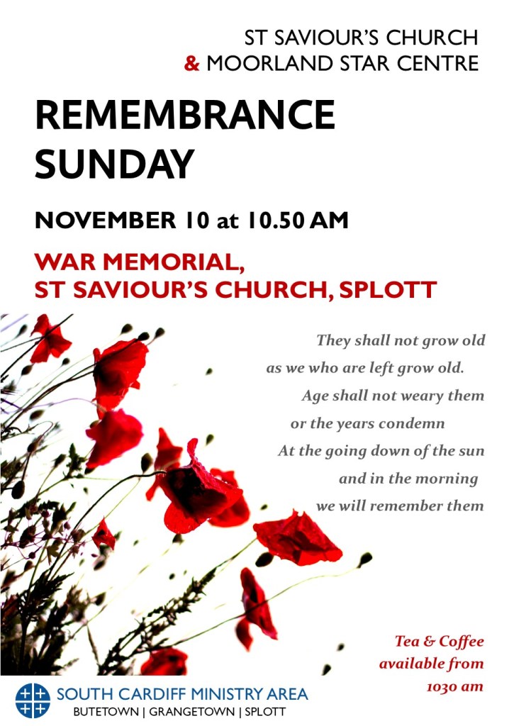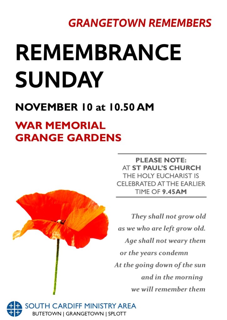 Please note: on this day the Eucharist at St Paul’s will be at the earlier time of 9.45am and there will also be a short act of remembrance at Ss Dyfrig and Samson at the end of Mass.