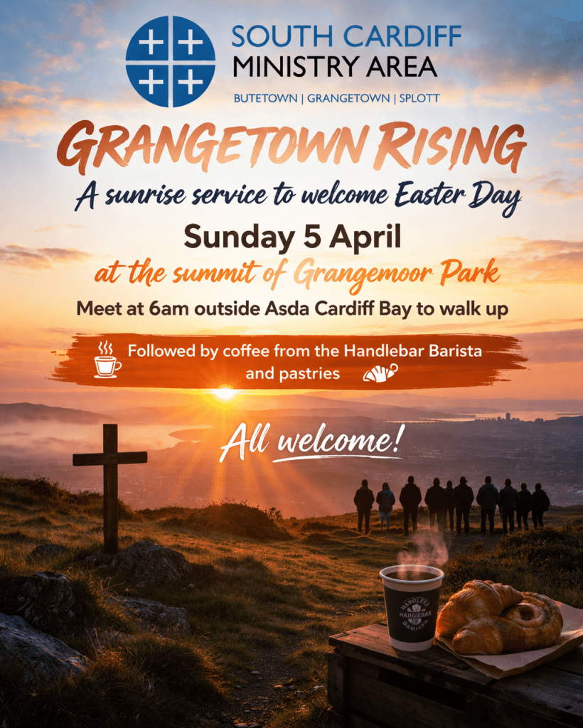 We will hold a short service to greet Easter Day and offer a blessing over our city. You’re invited to meet at the entrance of Asda in the Cardiff Bay Retail Park at 6am to walk to the summit. Afterwards we will enjoy coffee and pastries.