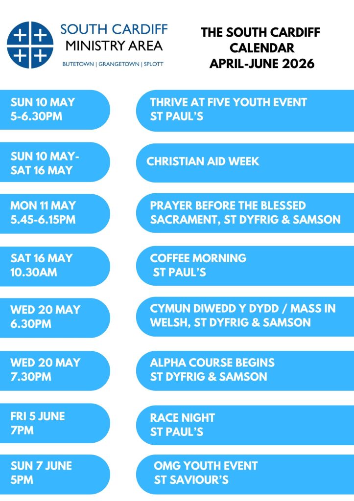 Here is a new-look South Cardiff Calendar, with details of lots of upcoming events and activities across our Ministry Area. Make sure you put everything down in your diary so that you don’t miss anything!