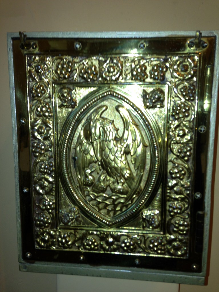 The decoration shows a pelican feeding its young with its own blood by pecking its chest. It is a traditional symbol of the Holy Eucharist.