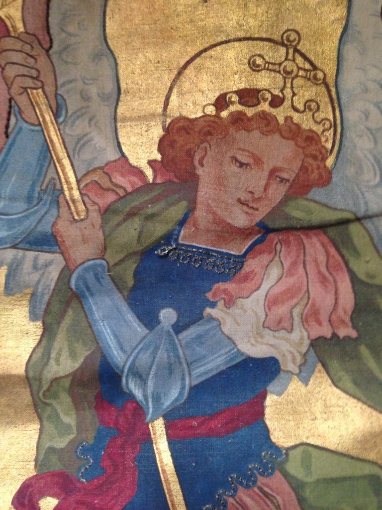 The St Michael’s Banner was a gift of Fr Nicholson for the “Lad’s Communion Guild.” Many of Fr Nicholson’s gifts can be found within St Saviour’s, including the East Window and the small window of the Archangels (including St Michael) set into the south side of the sanctuary above the sacristy.