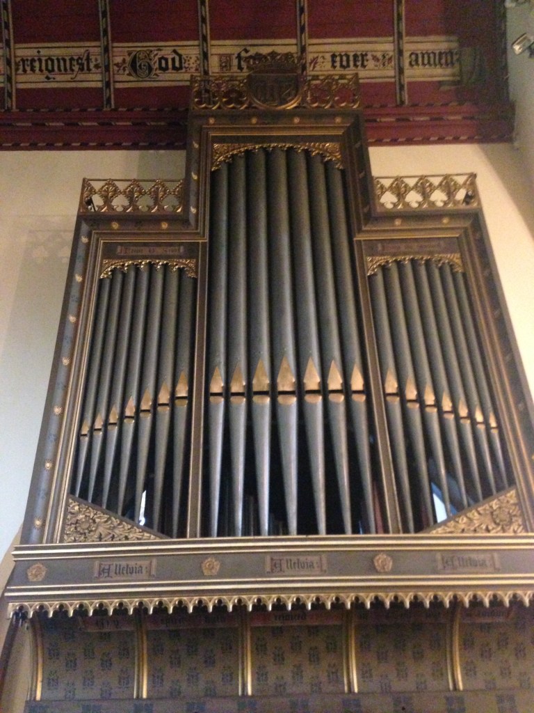 At the time of installation, the organ was still incomplete with several missing stops. These were later added for Easter 1900. The case was designed by G.F. Bodley, the architect of the church. Until 1948 it was blown by hand, a very exerting activity, and you can still see the mechanisms for this inside the organ.