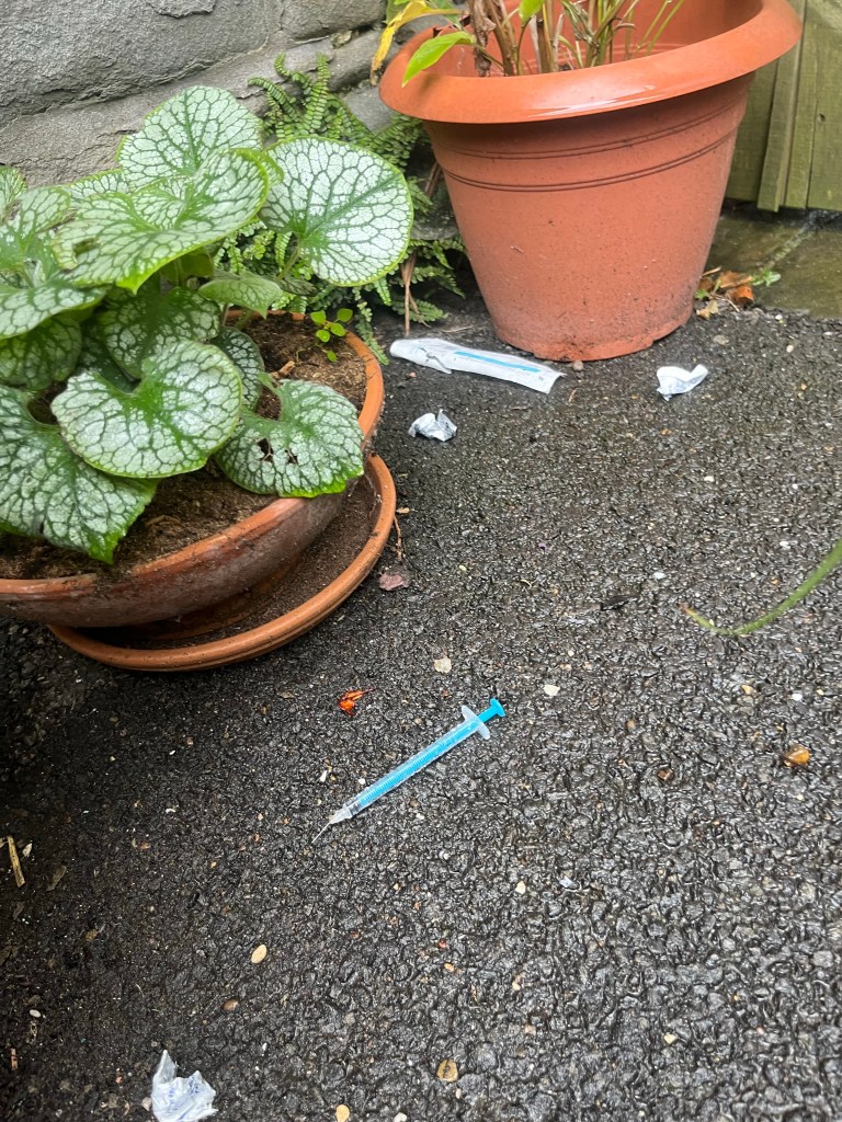 My CCTV tells me that two males were here yesterday at 3.30pm, the same time as children will be spilling out from school in less than a week’s time. They leave their needles and mess behind, move on.